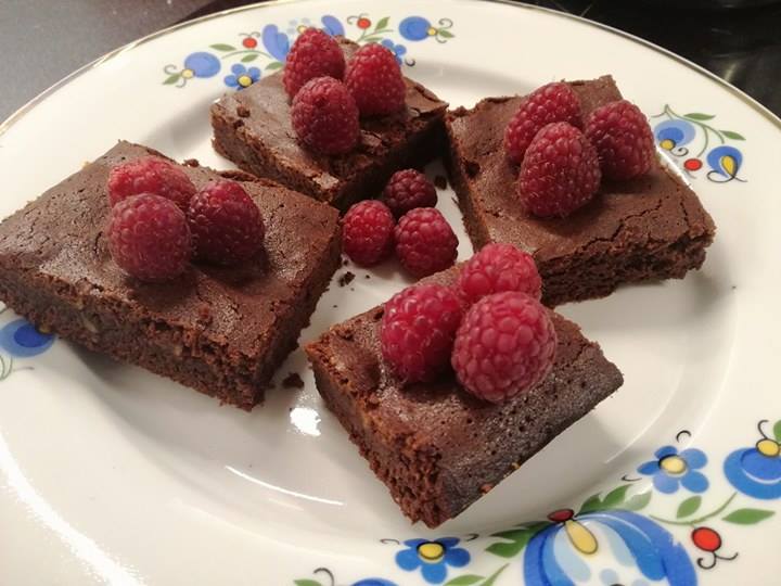 Brownie ozdobione pysznymi malinami.